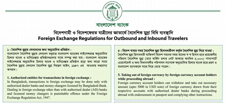 বিশেষ দ্রষ্টব্যঃ এখানে দেয়া বিজ্ঞপ্তিটি সেপ্টেম্বর ২০১৬ সালে প্রকাশিত আপডেট। কিন্তু আপনি যদি বর্তমান আপডেট জানতে চান, তবে এই লিংকে ক্লিক করুন। এরপর “Forex Transactions for Inbound and Outbound Travelers” এই ডকুমেন্টটি ক্লিক করে খুলে দেখুন। (Foreign exchange টপিক এর নিচে উক্ত ডকুমেন্টটি পাবেন।)